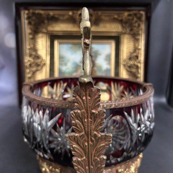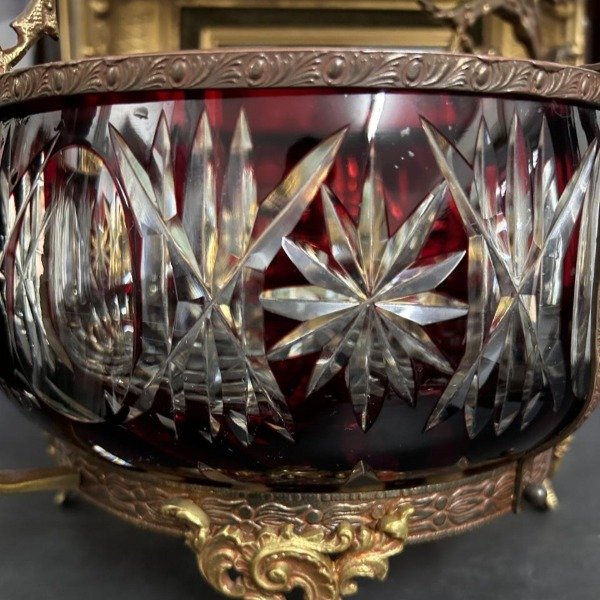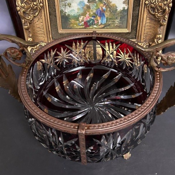 🌟 Impecable centro de cristal color rubí montura de bronce 🌟 Sin chips ni cachaduras 🌟 Divina talla 🌟 La broncearía está impecable sin nada suelto o flojo 🌟 Mide 31 de asa a asa 🌟 19cm de diámetro central 🌟14cm desde la base hasta el borde de la pieza🌟