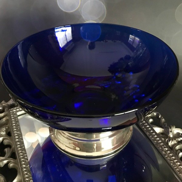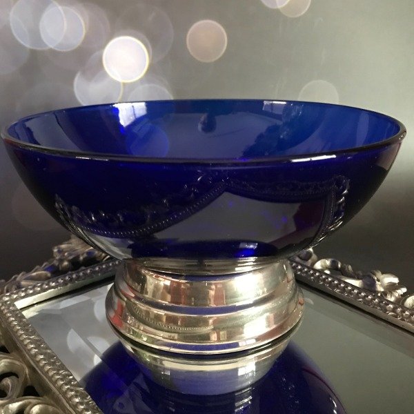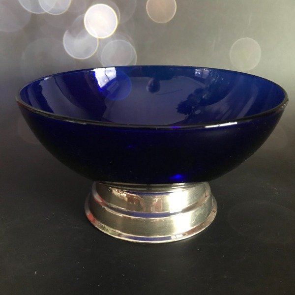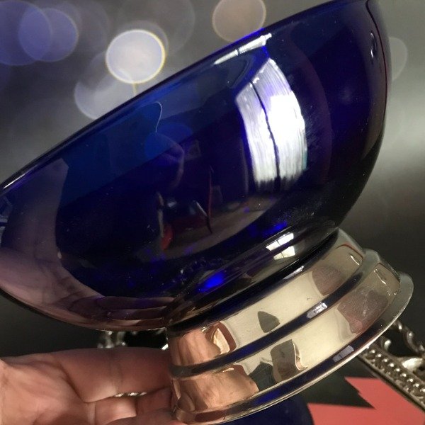 Se trata de un bowl azul cobalto platinado con base de metal.