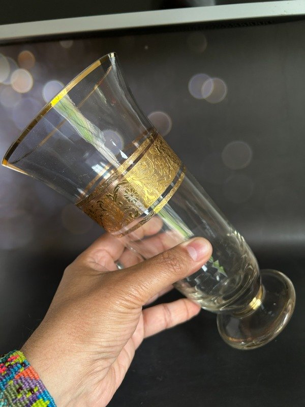 Ideal para quienes buscan una pieza clásica que combine belleza y funcionalidad, este Florero de Cristal con Guarda Dorada en Relieve será un tesoro apreciado en su hogar o colección, agregando un toque de distinción y glamour a cualquier espacio.
