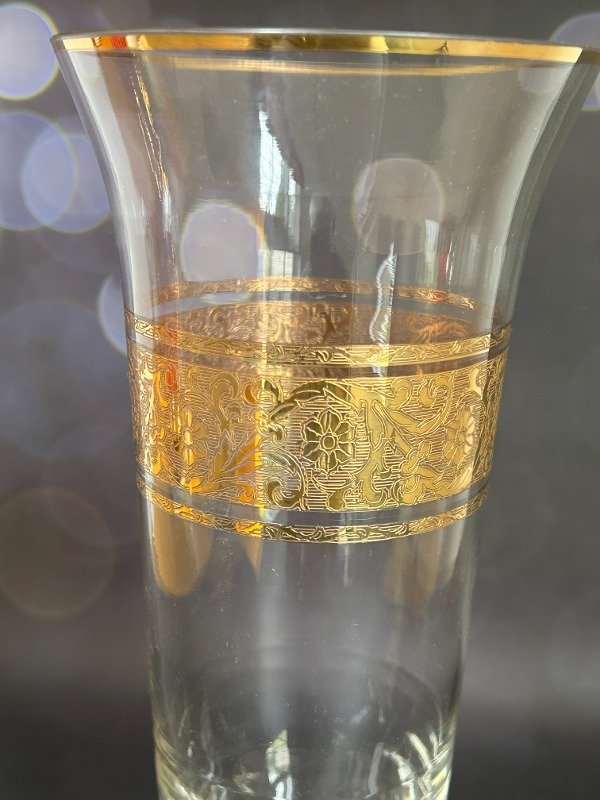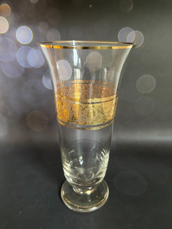 Este florero de cristal no solo es un objeto funcional para exhibir flores, sino también una pieza decorativa única que elevará la estética de cualquier habitación. Su diseño refinado y los detalles en dorado lo convierten en una adición elegante para cualquier colección de antigüedades.