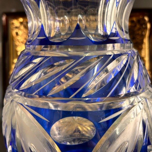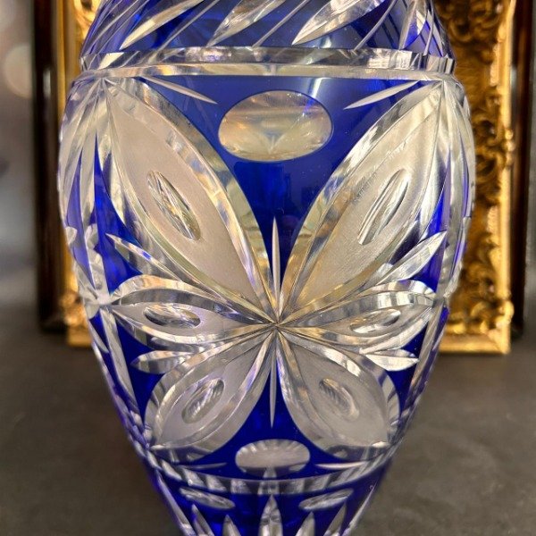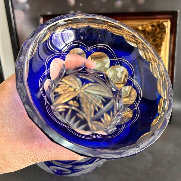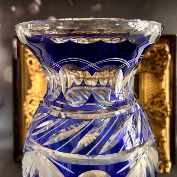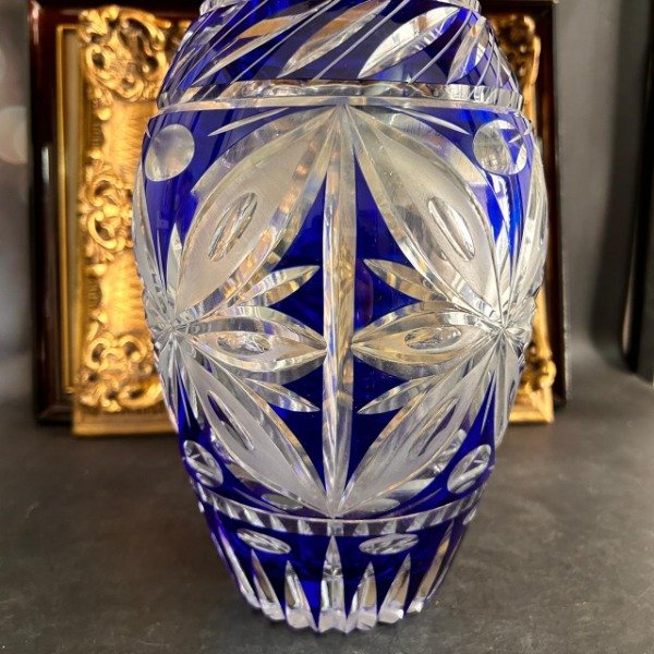 Excepcional florero de cristal encamisado azul en impecable estado.