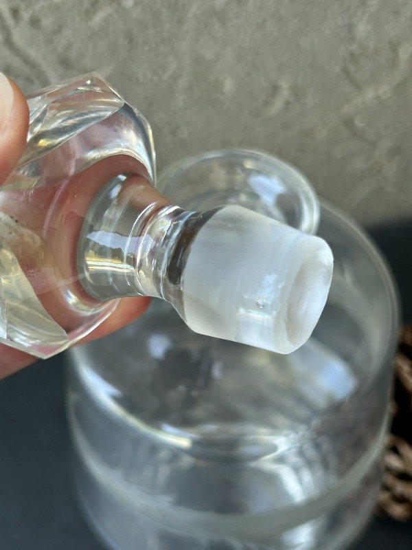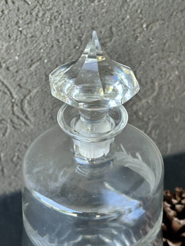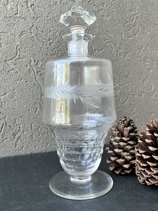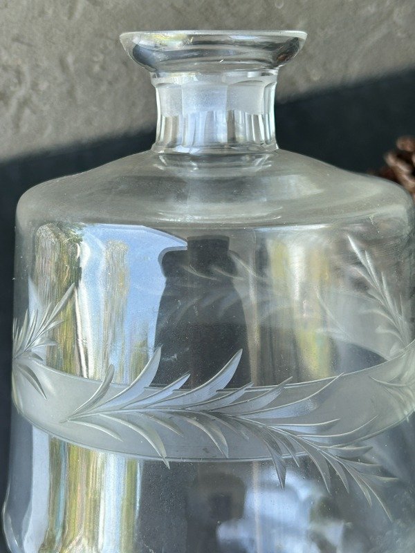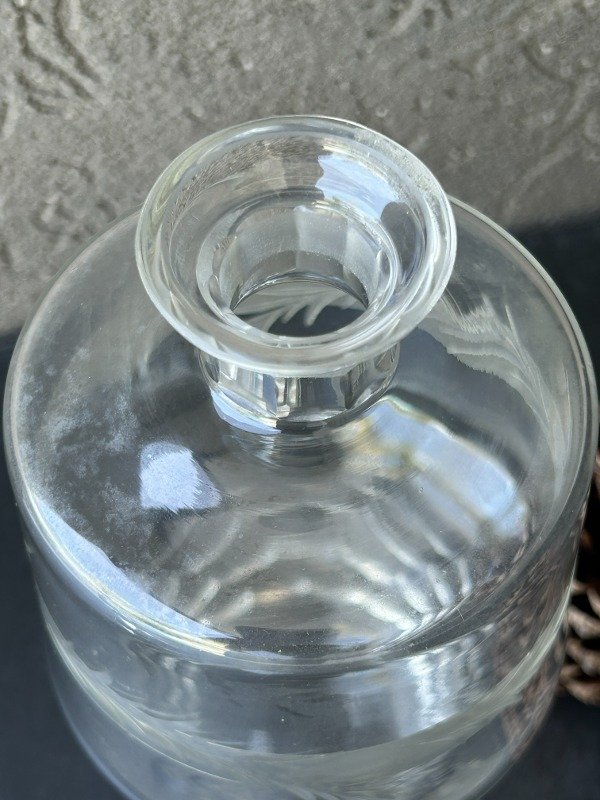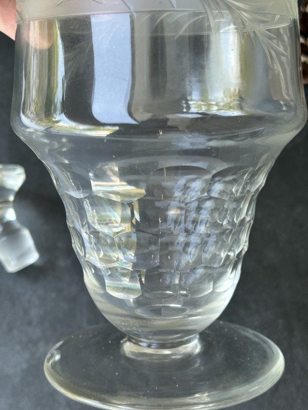 Vidrio esmerilado, tallado al acido en forma de ramas y en la base, se ve un diseño distinto que el resto de la pieza.