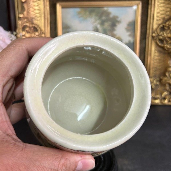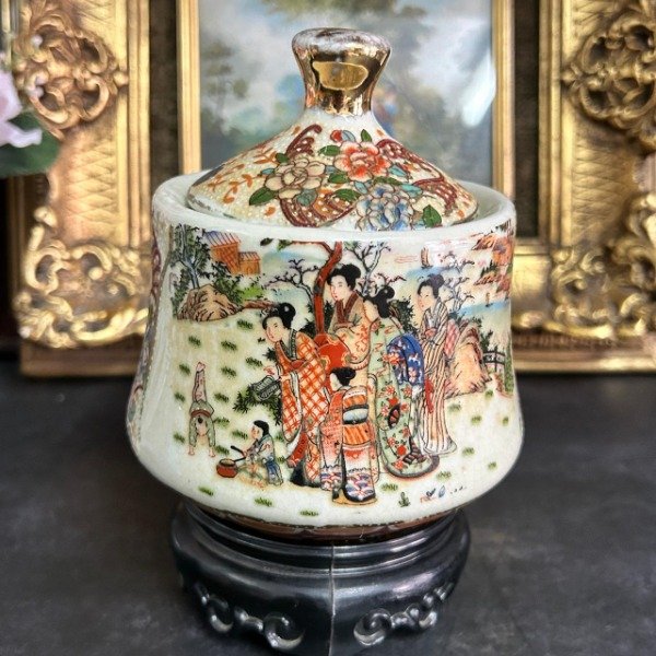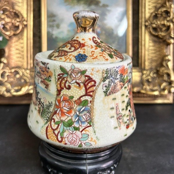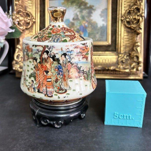 Estilo satsuma con imagenes de la vida cotidiana china reflejada alrededor de la pieza.