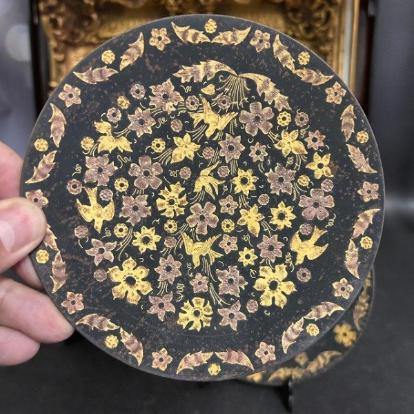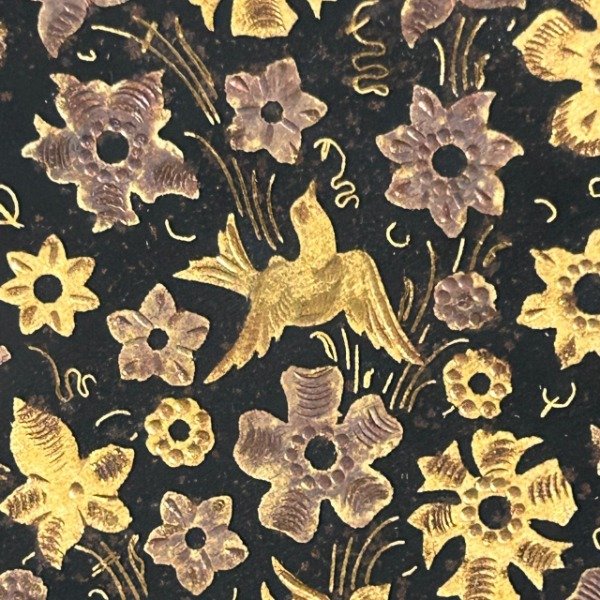 El diseño es de flores y aves dorados sobre fondo negro.