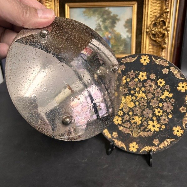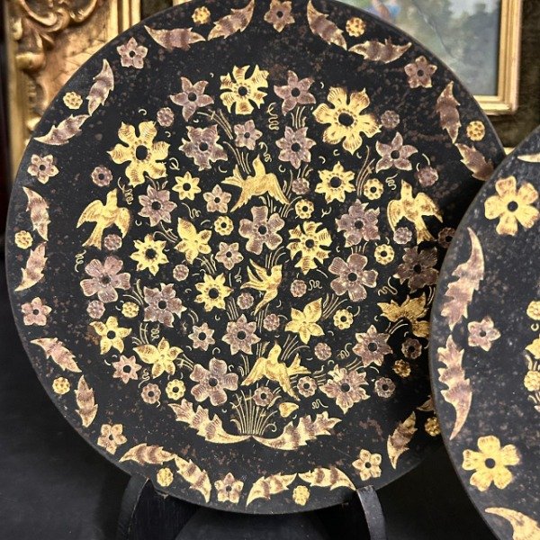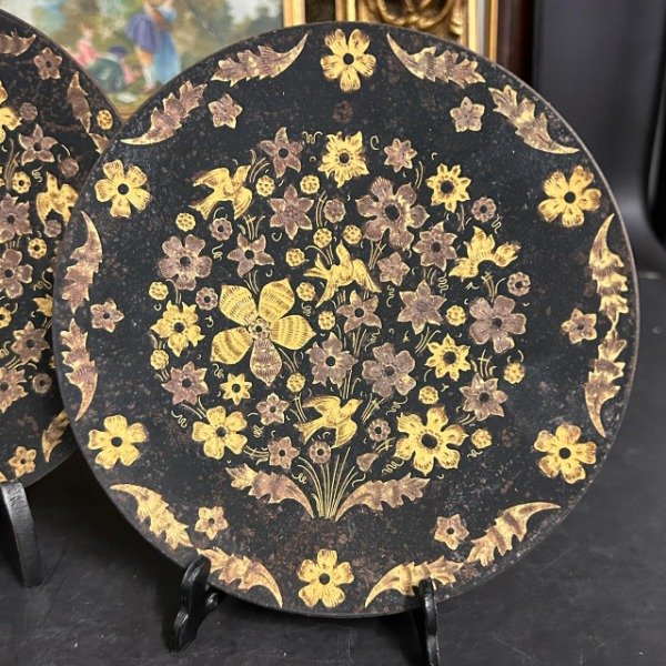Excepcional par de platos de metal con diseño en dorado estilo Toledo en impecable estado.