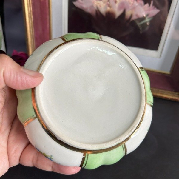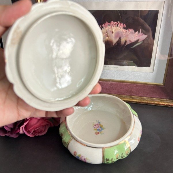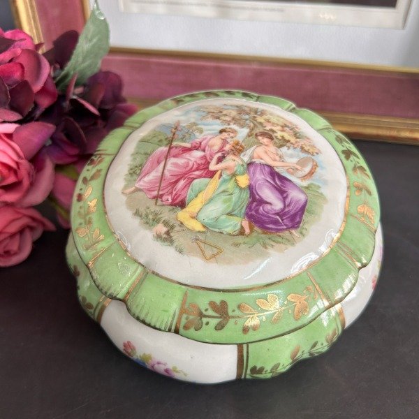 Alhajero de porcelana en color verde con vivos dorados y escena galante en la tapa