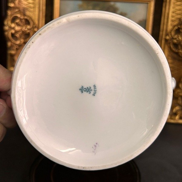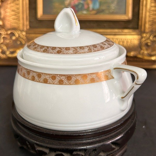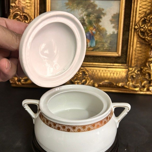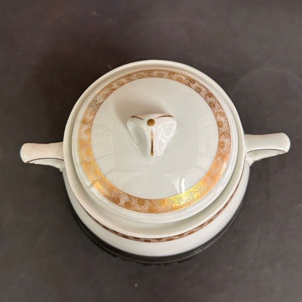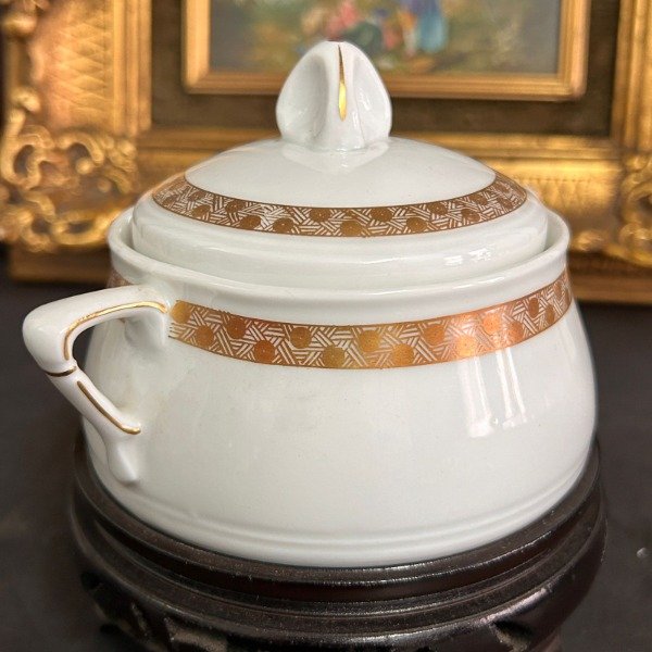 Es una pieza sobria de diseño simple y clásica con guardas doradas sobre fondo blanco.
