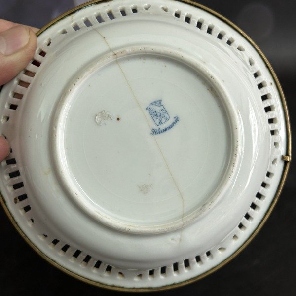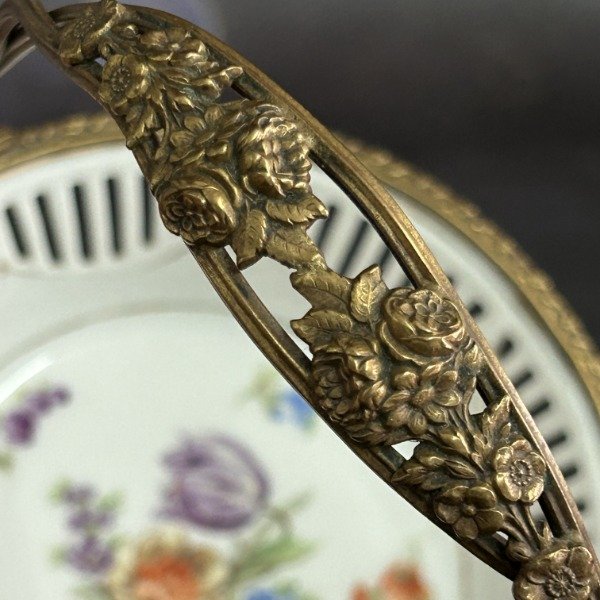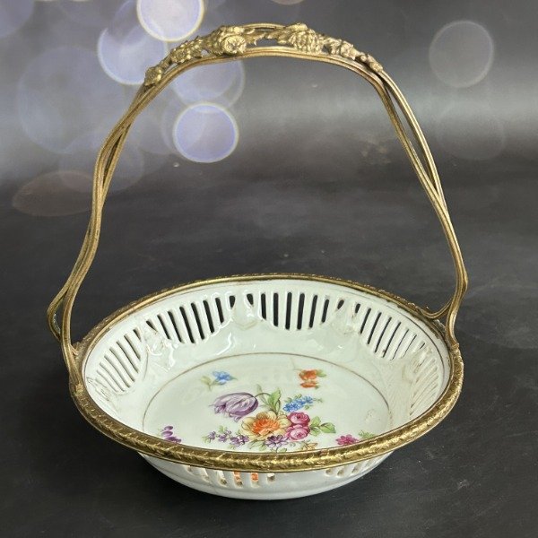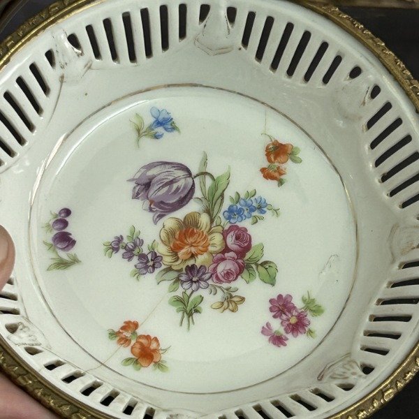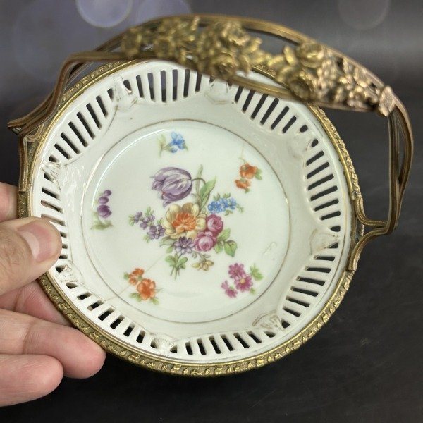 🌟 Hermosa canasta de porcelana alemana con montura de bronce 🌟 Divina 🌟 El plato calado con flores es un clásico del diseño alemán 🌟 La montura impecable con flores y hojas en relieve 🌟 Una belleza 🌟 Lástima que el plato tiene el detalle de la última foto 🌟 A pesar de ello, la canasta cumple con su función 🌟 Bombonera, caramelera, despojador de bijou y mucho más 🌟