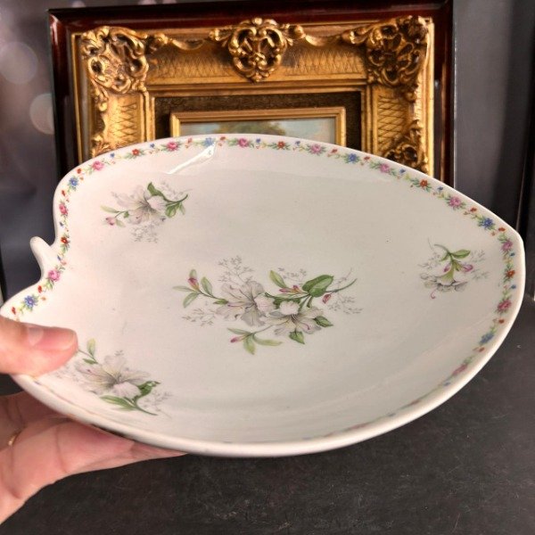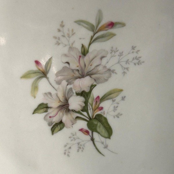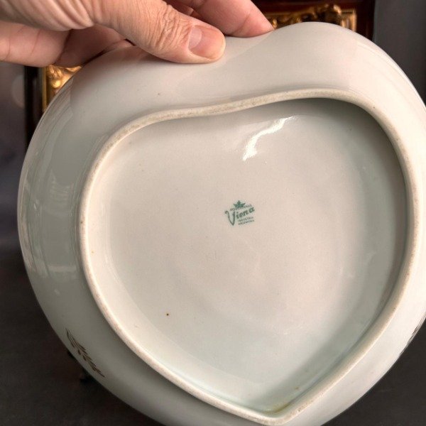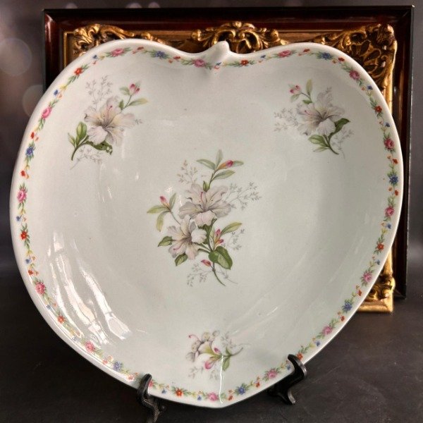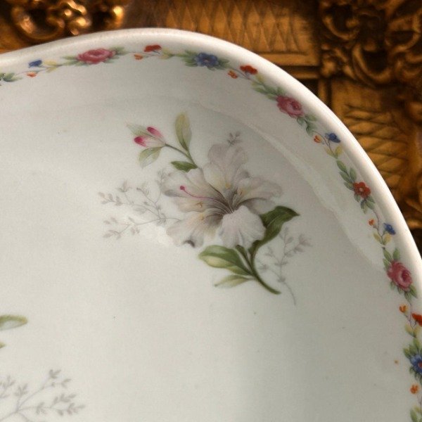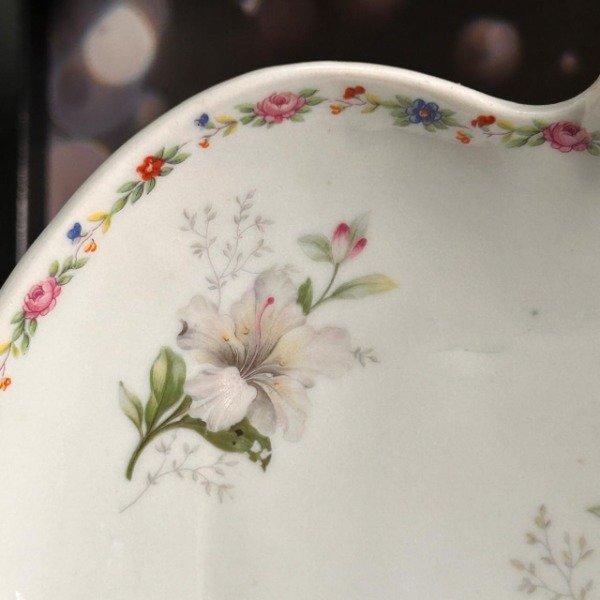 Con forma de frutilla, tiene flores blancas y una guarda de flores rosa y azules en el borde.
