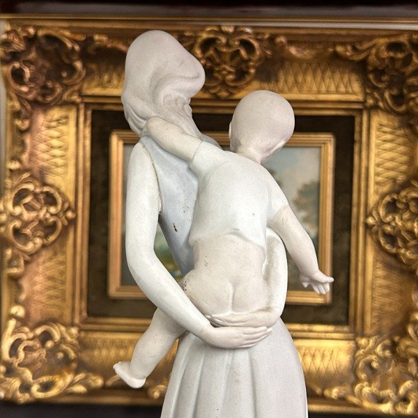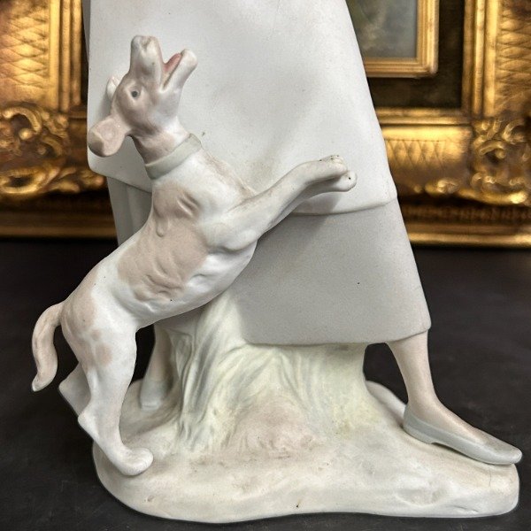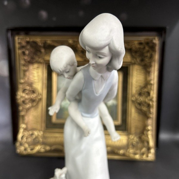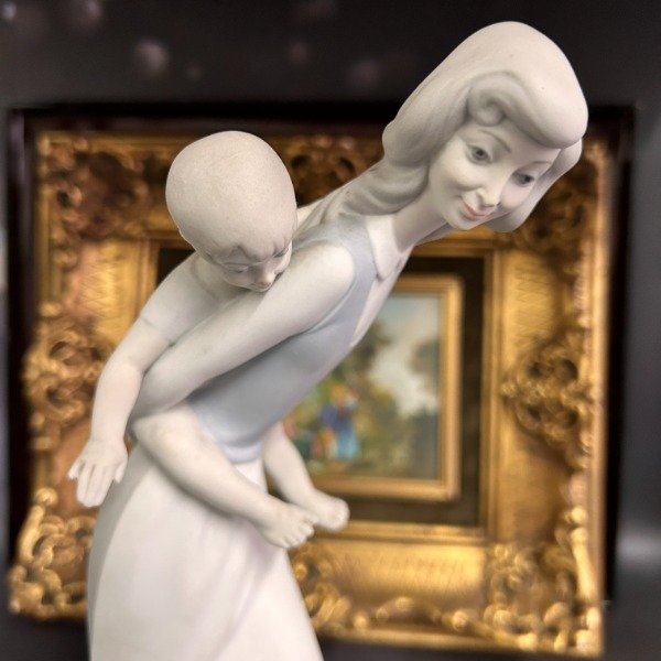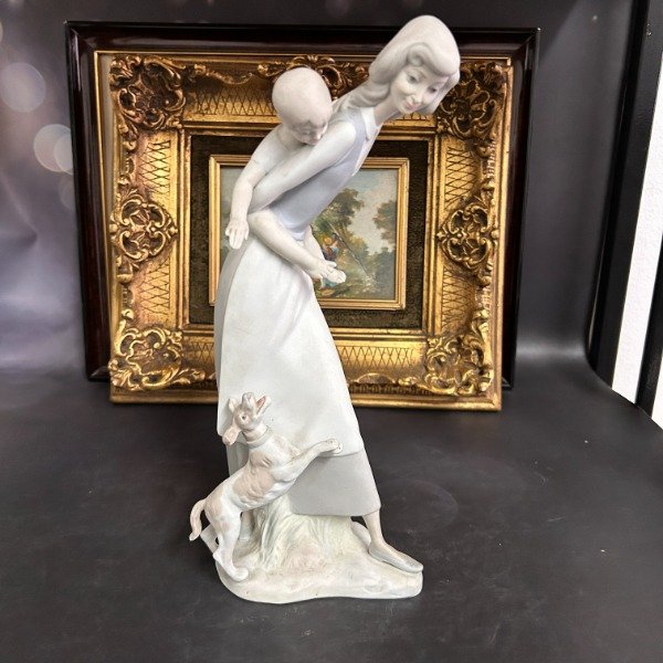🌟 Excepcional pieza de porcelana en impecable estado 🌟 Representa una mujer o madre con un niño en la espalda y un perro 🌟 Evidentemente están jugando por los gestos de la mujer y el juego que le hace el perro 🌟 La figura tiene colores suaves pero con mucho detalle de diseño 🌟 El perro está en posición de salto con las orejas en movimiento 🌟 Es preciosa 🌟Mide 28cm de alto y 13cm de diámetro aprox 🌟