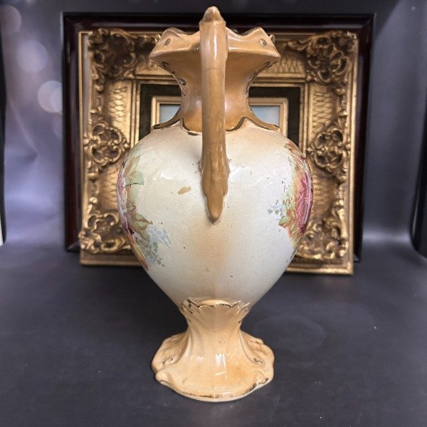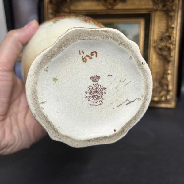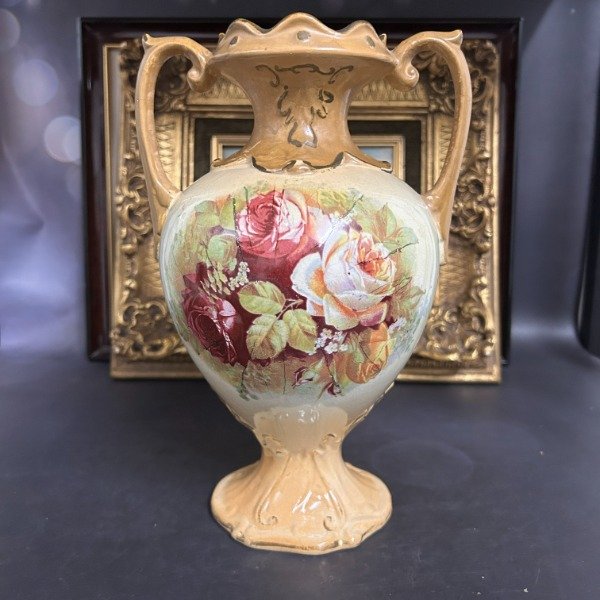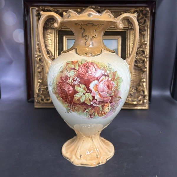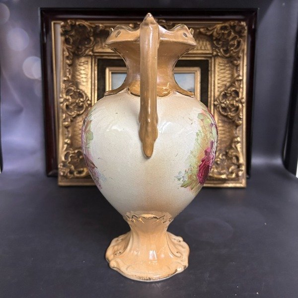🌟 Excepcional florero de la marca GRIMWADE’S STOKE ON TRENT England 🏴🌟 Impecable 🌟 Sin chips ni cachaduras 🌟 Mide 24cm de alto y 15cm de diametro 🌟 El diseño es de rosas sobre un fondo marrón claro con asas que terminan en la boca de la pieza 🌟 En la base simula unas llamas que forman parte de la base 🌟 La marca es conocida como Royal Winton y fue establecida en Stroke on Trent en 1888 🌟