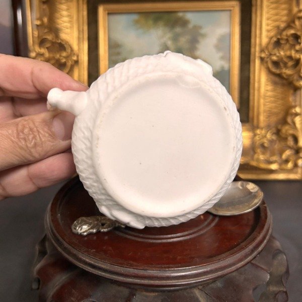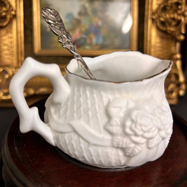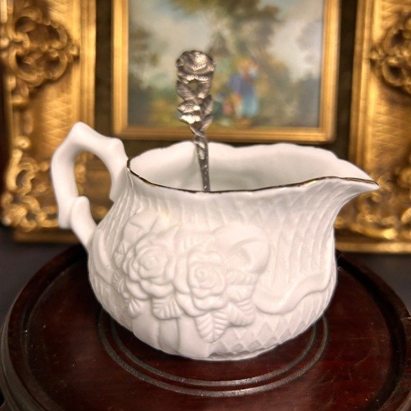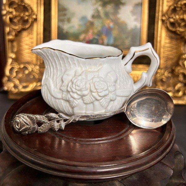 Se trata de una jarrita blanca con diseño en sobre relieve y vivos dorados y una cucharita de metal plateado con mango en forma de rosa