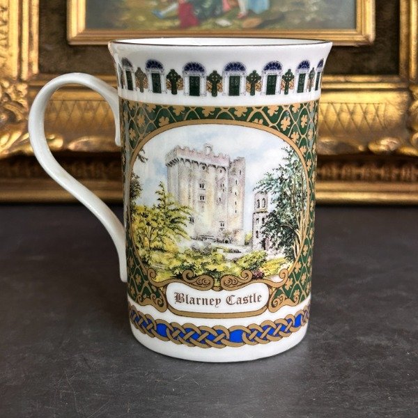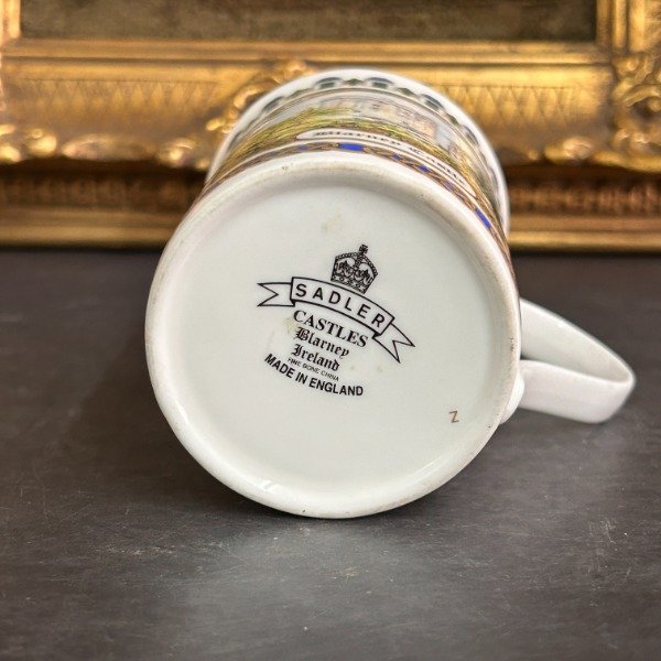 🌟 Excleente mug de porcelana de la casa Sadler England 🏴🌟 Impecable 🌟 Sin chips ni cachaduras 🌟 La pieza detalla en una imagen pintada a mano el castillo de Blarney 🌟 Enmarcada en una guarda verde con dorado donde se ven pequeños tréboles 🌟 En la parte de abajo hay otra guarda en dorado y azul cobalto 🌟 El conjunto es precioso 🌟 El borde de la taza tiene n filete dorado 🌟 Mide 10cm de alto y 7cm de diámetro en la boca 🌟 En la base tiene el sello de la marca con un texto que dice “made in England”