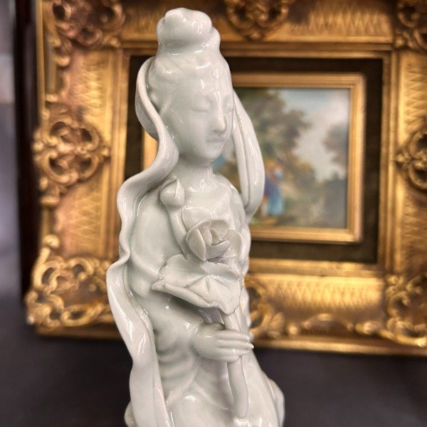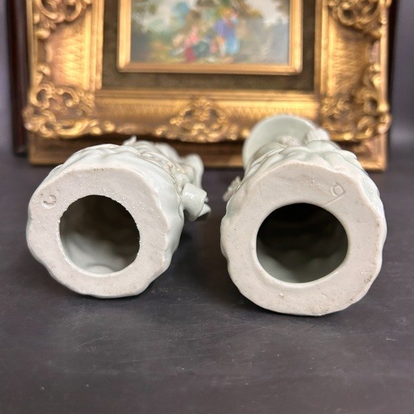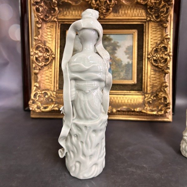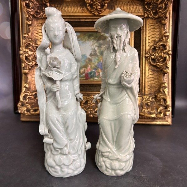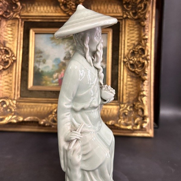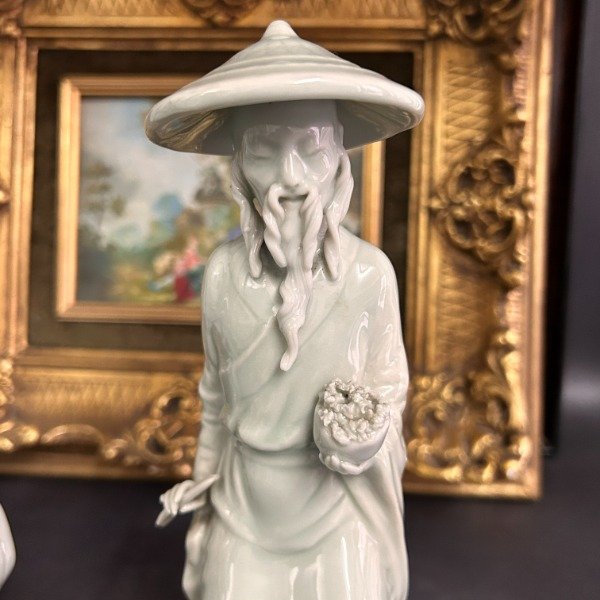 🌟 Excepcional par de figuras orientales de porcelana en impecable estado 🌟 En verde agua suave se trata de una pareja de oriente con mucho detalle de diseño 🌟 El caballero con barba y sombrero de paja sosteniendo un cuenco 🌟 La dama sosteniendo una flor con los pétalos en sobre relieve 🌟 En ambos casos se puede ver que se ha logrado el movimiento del viento en las prendas 🌟 Una maravilla 🌟 Sin chips ni cachaduras 🌟