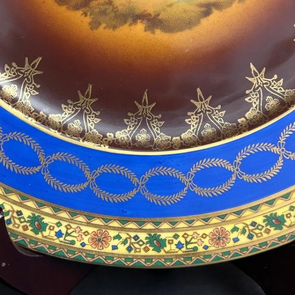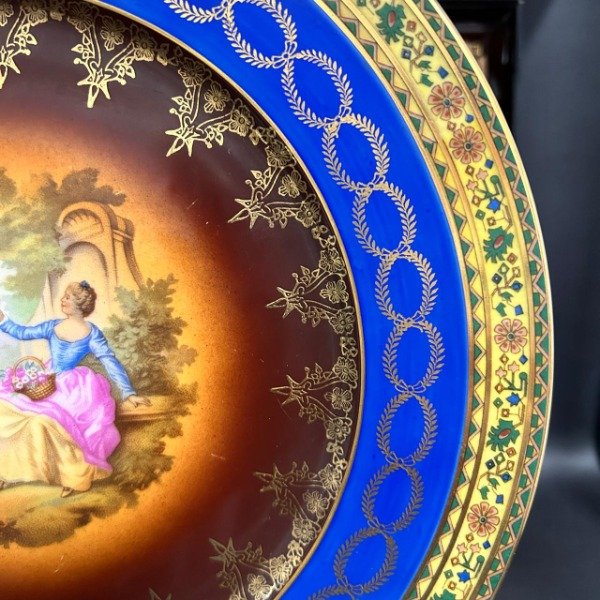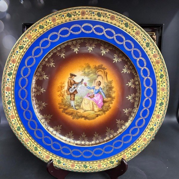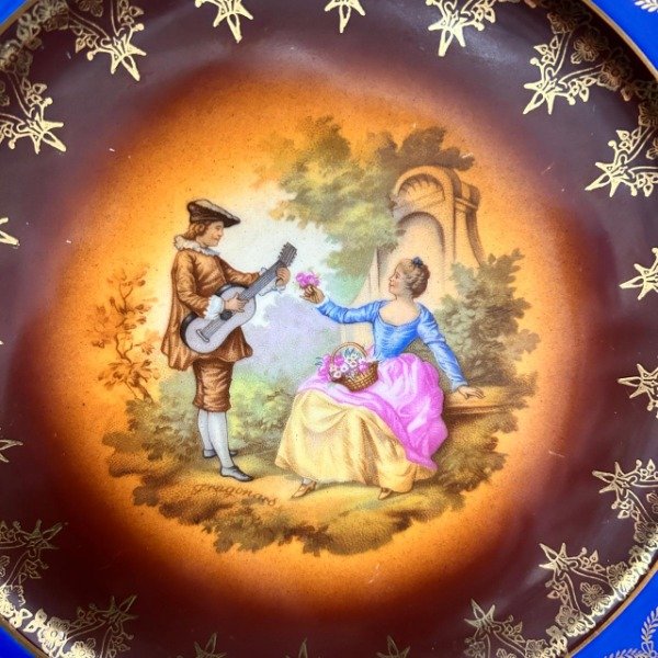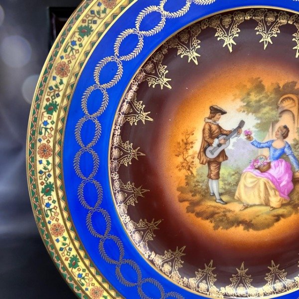 🌟 Espectacular plato de porcelana Western Germany 🇩🇪 en impecable estado 🌟 Una pieza única con detalles de diseño espectaculares 🌟 Una escena galante central con marco en marrón y filetes dorados 🌟 Luego una guarda en azul cobalto con guirnaldas doradas 🌟 Finalmente en el borde externo una marco en tonos claros con flores y guardas geométricas 🌟 Mide 28cm de diámetro 🌟