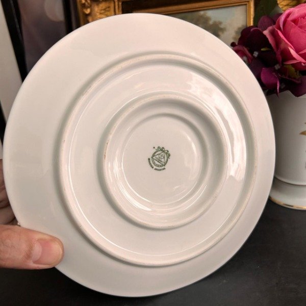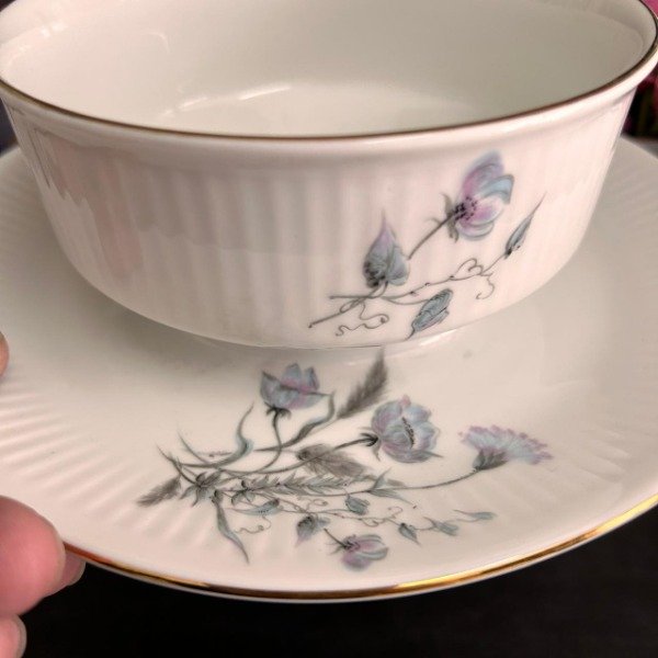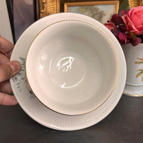 🌟 Diseño clásico blanco con flores celestes y grises y filete dorado 😱