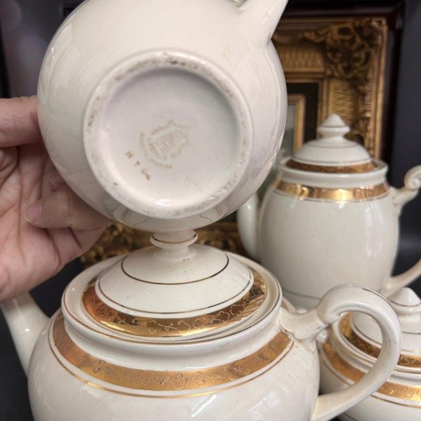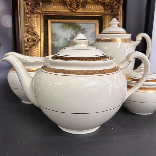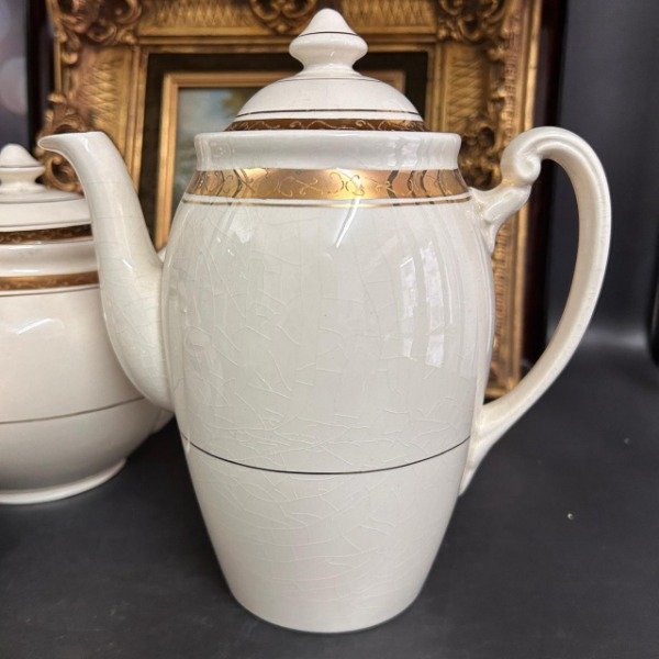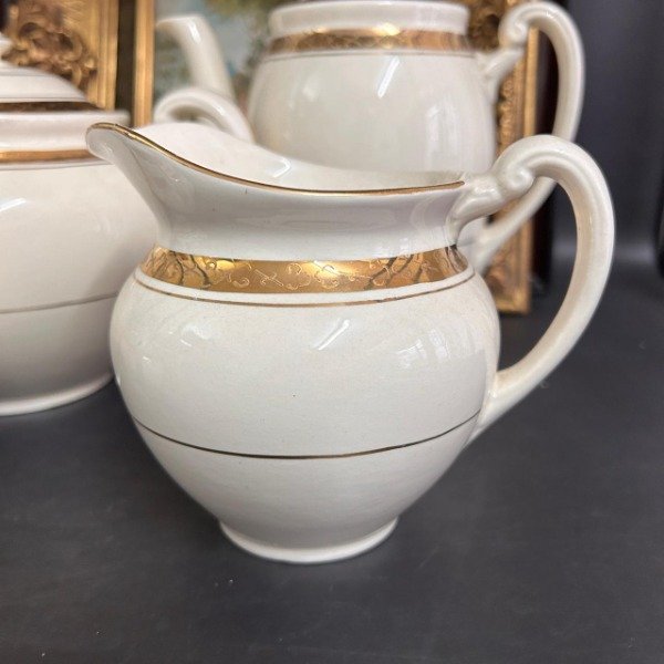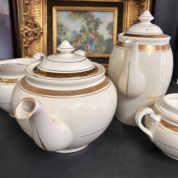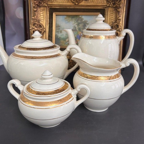 🌟 Servicio de té y café loza nacional Lozalit 🌟 Impecable 🌟 Tetera, Cafetera, Azucarera y Lechera 🌟 Sin chips ni cachaduras 🌟 Diseño de guarda dorada sobre donde blanco crema 🌟 Un clásico 🌟Van algunas de regalo