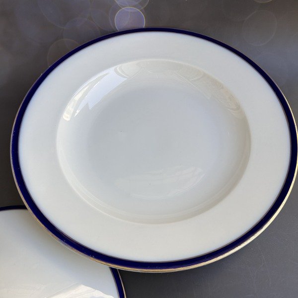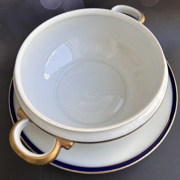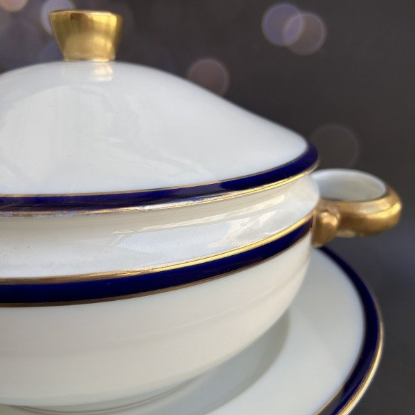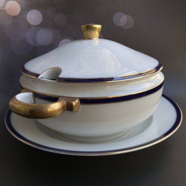 Se trata de una sopera de gran tamaño con vivos azules y ribetes dorados.