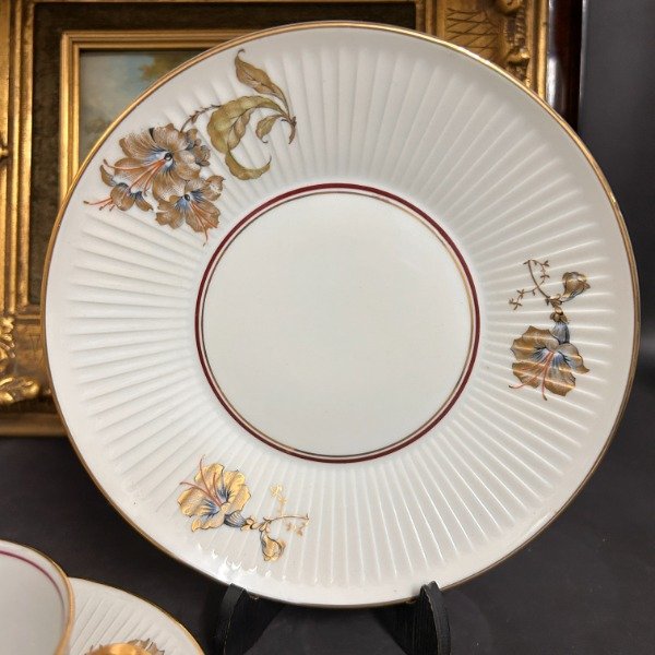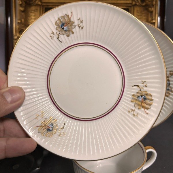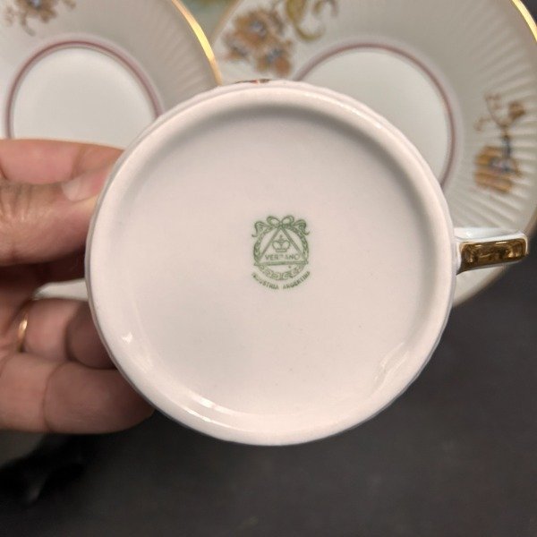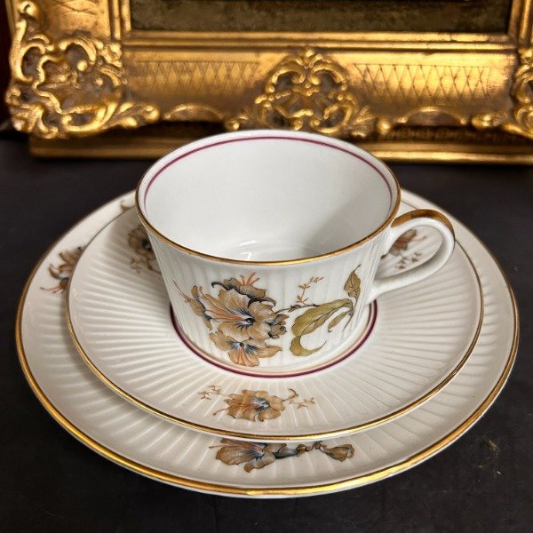 La taza mide 8cm de diámetro y 5cm de alto. El plato de té mide 14cm de diámetro y el plato de postre mide 17,5cm de diámetro.