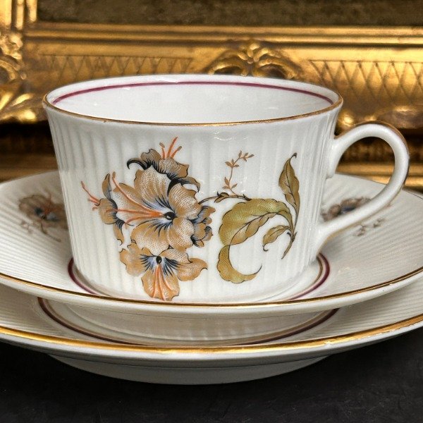 Un diseño de flores en color ocre con filetes dorados y bordo